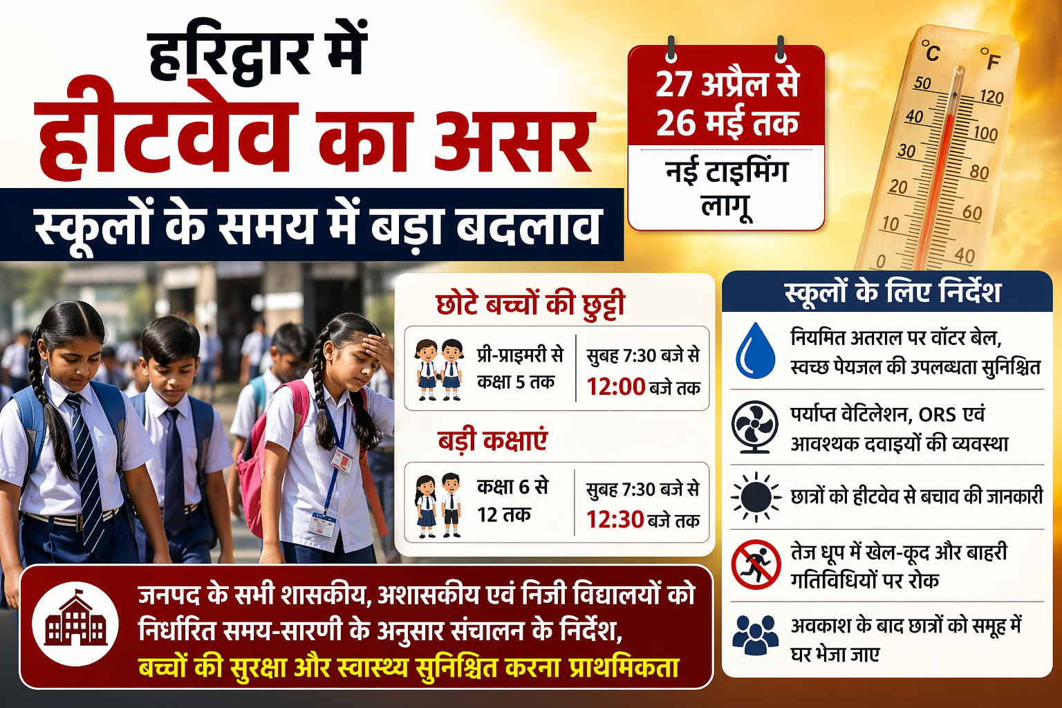 शासन के निर्देशों के क्रम में जिलाधिकारी मयूर दीक्षित ने बच्चों की सुरक्षा को प्राथमिकता देते हुए 27 अप्रैल 2026 से 26 मई 2026 तक जनपद हरिद्वार के सभी विद्यालयों के समय में परिवर्तन किया है।